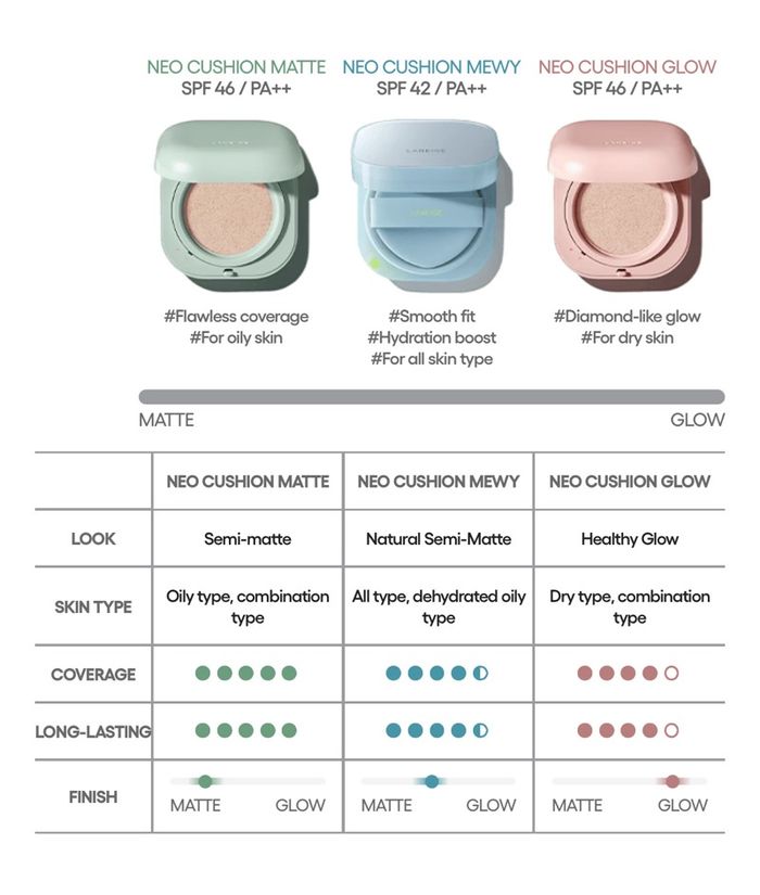 Laneige брэндийн цоо шинэхэн бүтээгдэхүүн болох NEO MEWY CUSHION 🤩 🌱Энэхүү күшин нь бүх төрлийн арьсанд болон чийгээ алдсан тослог тохиромжтой. Та бүхний сайн мэдэх матте болон глоүв төрлүүдийн яг голд нь багтах төрөл ба натурал хагас матте төгсгөлтэй. Тогтоц, өө даралт: 4.5/5