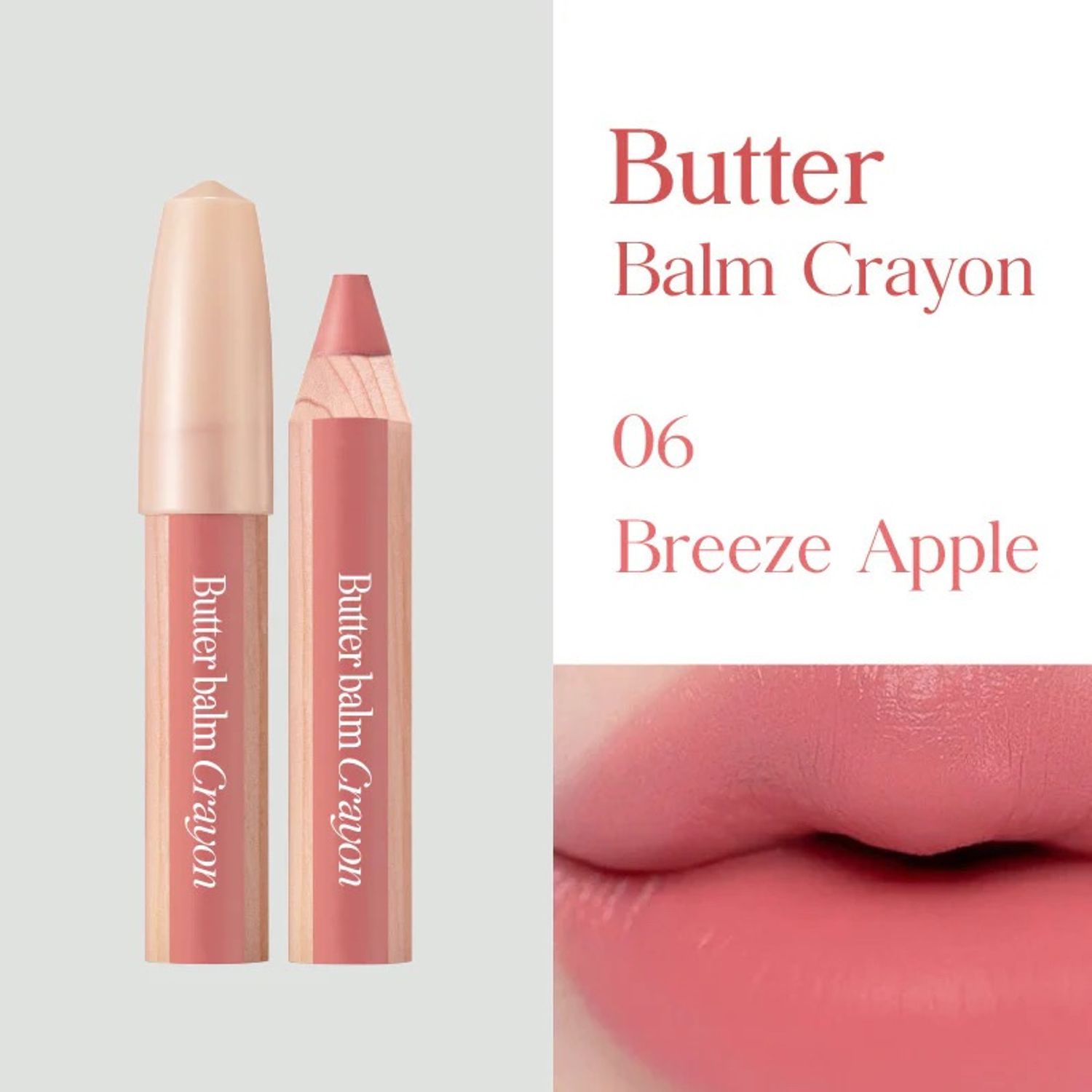 💄 Clio Butter Balm Crayon: CLIO-ийн Butter Balm Crayon цувралын 06 Breeze Apple нь шинэхэн, амьд алимлаг улаан өнгөтэй, уруул ба хацарт хоёуланд нь хэрэглэх боломжтой кремэн балм-крэйон/Чех улсад үйлдвэрлэсэн модон харандаа/ юм. Энэ өнгө нь 🍎 Fresh apple red